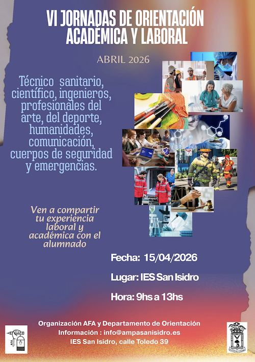 El 15 de abril celebraremos en el instituto, junto con el Departamento de Orientación, la VI edición de las Jornadas de Orientación Académica y Laboral. En ellas ofrecemos al alumnado de 4º de ESO y de Bachillerato un recorrido por diferentes profesiones, en el que se explican los itinerarios académicos y las características de cada una.